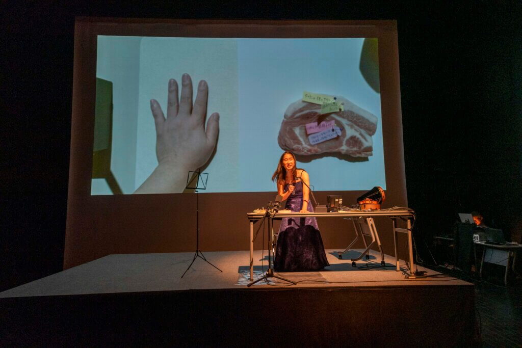 〈I’m Meat!〉 is a lecture performance by a violinist rooted in classical music, exploring the musician’s body.